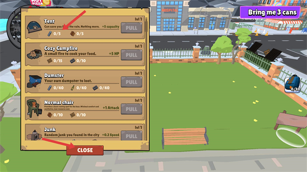 2、打開物品列表界面,可查看帳篷、篝火等可獲取的生存道具,每個道具標注了效果與所需材料,確認后點擊PULL獲取,提升生存能力。