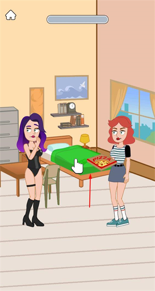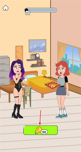 3、進入后續劇情場景,看到披薩女孩與另一位角色,點擊界面的燈泡按鈕,觸發對應的互動內容。