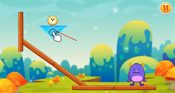 3、進入第1關游戲頁面,看到傾斜木板與帶時鐘的三角物件,點擊三角物件完成關卡內的對應操作。