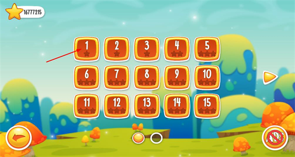 2、進入關卡選擇頁面,展示1至15關的關卡按鈕,選擇第1關按鈕,進入該關卡的游戲操作頁面。