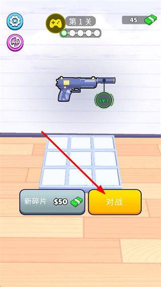 1、進入游戲第1關界面,可看到當前裝備的LV2槍械,點擊對戰按鈕即可進入關卡,開啟射擊闖關挑戰,推進游戲進程。