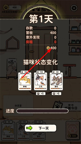 4、結算完成后會顯示當日營收等數據,點擊下一天按鈕,即可進入次日的貓咖經營場景,繼續完成經營任務以應對房租等支出。