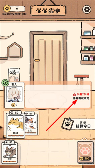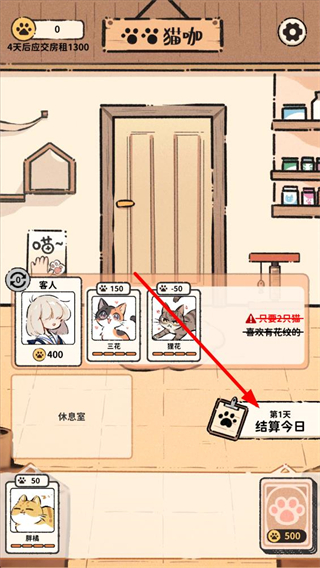 3、滿足客人需求后,可點擊結算今日按鈕,統計當日的經營收益,同時貓咪狀態會發生變化,需關注其狀態調整經營策略。