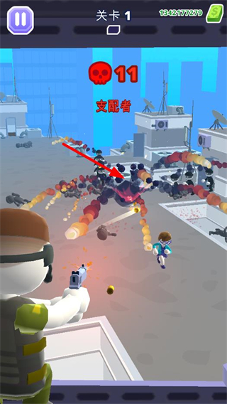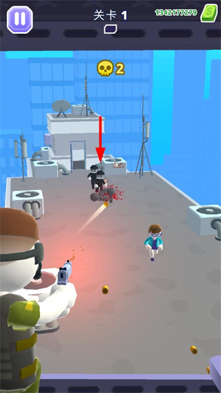 1、操控角色持槍射擊敵人,擊敗靠近的黑衣對手,擊殺敵人可積累骷髏計數,推進關卡進程。