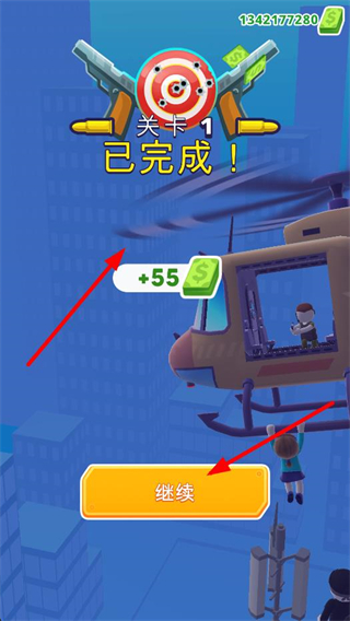 4、完成關卡后會顯示關卡已完成界面,獲得55金幣獎勵,此時點擊繼續按鈕,即可進入下一關,開啟新的救援與戰斗任務。