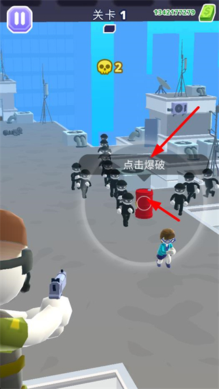 2、遇到聚集的敵人時,找到場景內的紅色油桶,點擊爆破觸發油桶爆炸,借助爆炸范圍一次性消滅多名敵人,提升清敵效率。
