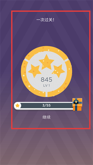 4、完成所有收集目標后,會顯示一次過關的結算界面,獲得星級評分與金幣獎勵,點擊繼續按鈕即可進入下一關,繼續挑戰更高難度的圓點布局。