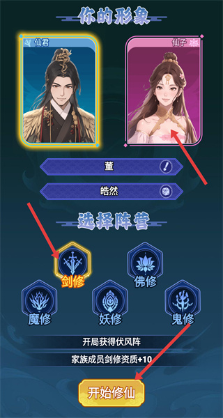1、進入游戲后,先選擇仙君或仙子的形象,再從劍修等陣營中選定一個,確認選擇后點擊開始修仙按鈕,就能進入游戲的主游玩界面。
