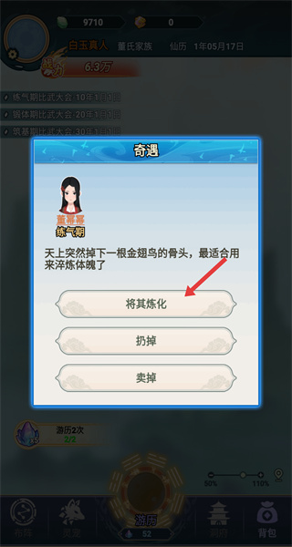 3、游歷過程里會觸發奇遇彈窗,彈窗中會呈現不同的操作選項,選擇對應的選項比如將其煉化,便能獲得對應的增益或道具獎勵。