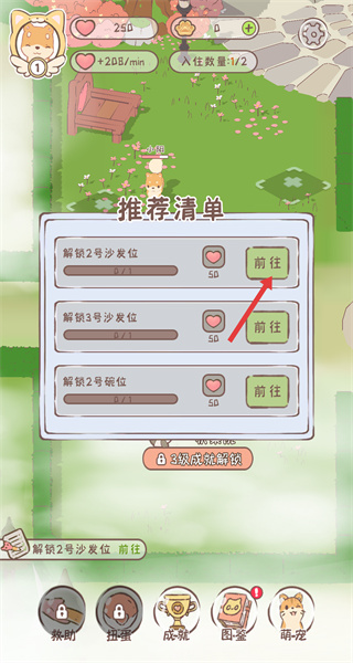 1、在游戲主界面中找到底部標注的解鎖2號沙發位相關提示,打開對應的推薦清單界面,為后續解鎖操作做準備。