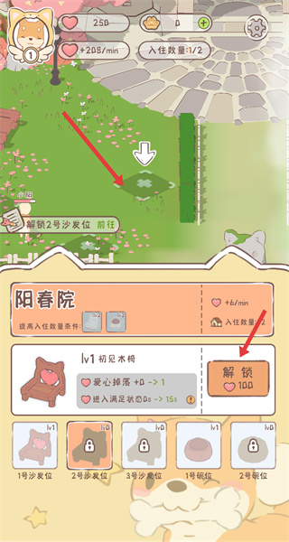 3、進入對應場景區域后,找到界面里的初見木椅解鎖選項,確認所需消耗的愛心,點擊解鎖按鈕,完成該設施位置的解鎖操作。