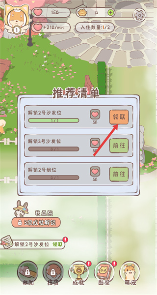 4、完成解鎖后返回推薦清單界面,找到解鎖2號沙發位對應的領取按鈕,點擊該按鈕,獲取此次解鎖對應的獎勵,進一步推進游戲進度。