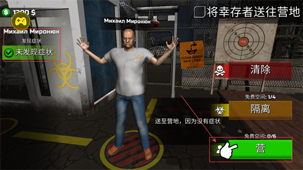 3、檢測結果顯示未發現癥狀的幸存者,屬于健康人員,點擊營按鈕將其送往營地,這是補充營地人員、推進游戲進度操作。