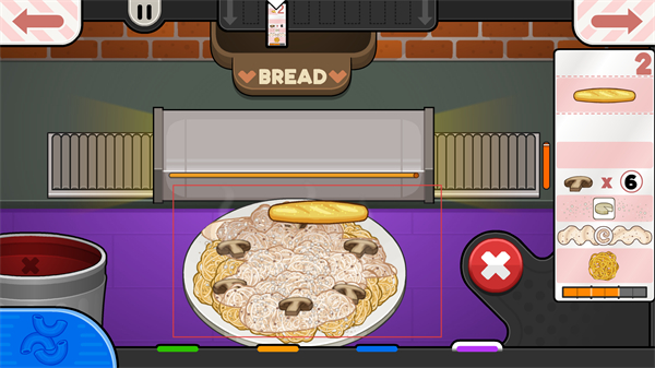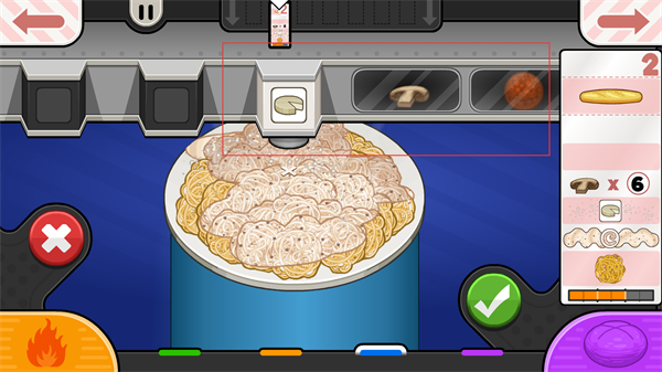 2、選擇對應的配料添加到意大利面上,完成餐品的配料環節,點擊對勾確認配料完成。