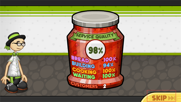 4、查看服務質量統計界面,了解各環節的評分情況,點擊SKIP跳過統計界面繼續經營。