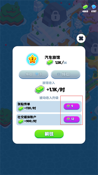 1、選擇對應的選項升級被動收入,提升汽車旅館的每小時收益,點擊前往進入旅館的運營界面。