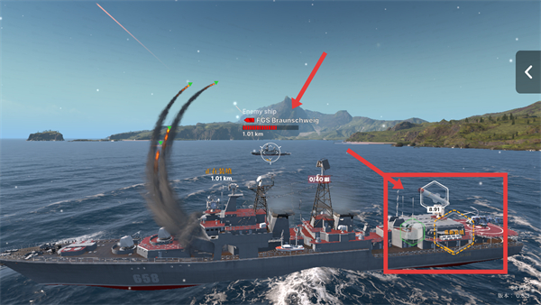 3、當遭遇敵方攻擊時,找到戰艦上的攻擊裝置按鈕,將攻擊中心點對準攻擊目標,此時即可鎖定敵艦,點擊后可啟動攻擊機制向敵方開火。