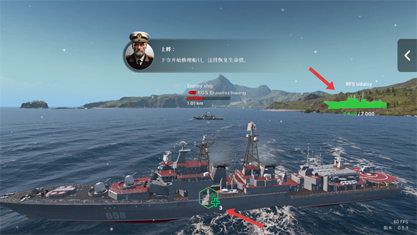 4、當戰艦生命值下降時,找到回血按鈕使用補給,長按可以恢復戰艦生命值,同時結合敵方位置調整自身站位,持續推進對戰節奏。