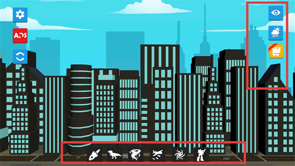 2、進入城市場景后先查看破壞工具欄,如底部的工具破壞如怪獸、火箭等,或右邊的自然環境模擬破壞,選定后即可激活對應破壞方式。