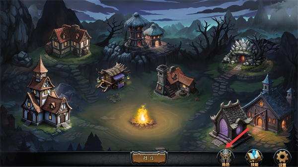 2、進入主場景后,可見各類建筑與篝火區域,底部有戰斗、角色等功能按鈕,點擊角色按鈕可進入角色界面。