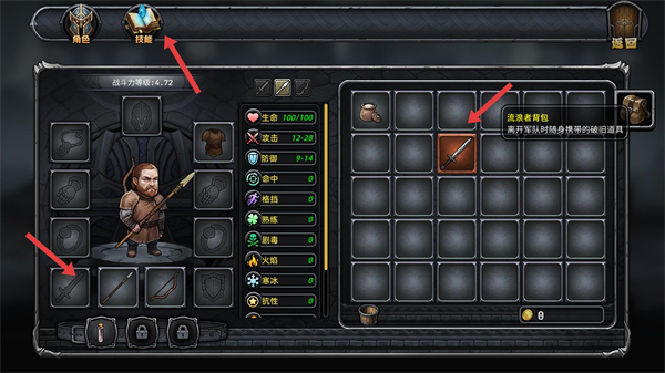 3、進入角色界面后,能查看戰力、生命等屬性,背包欄可查看攜帶道具,點擊武器欄的裝備可進行穿戴,增強戰斗能力,再點擊【技能】。