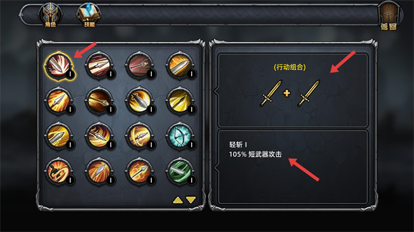4、進入技能界面后,可選擇技能組合,不同組合對應不同戰斗效果,選定輕斬類技能能提升短武器攻擊,合理搭配技能組合可優化戰斗策略,提升對戰效率。