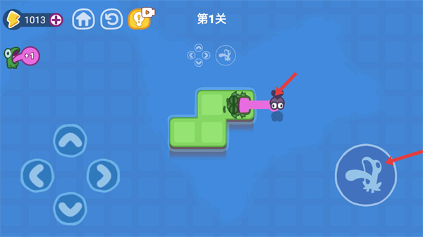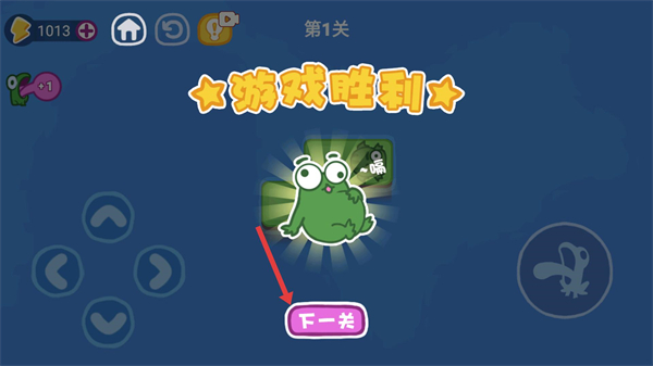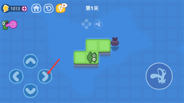 2、進入第1關后,左側方向鍵可操控青蛙移動,先通過方向鍵讓青蛙向目標方向移動,靠近場景中的敵人,這是完成關卡的前置步驟。