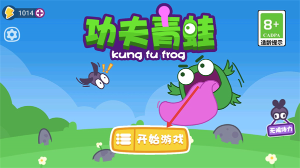 1、界面顯示游戲啟動頁,點擊開始游戲可進入關卡,這是開啟游戲的關鍵操作,后續需操控青蛙完成關卡任務,推進游戲進度。