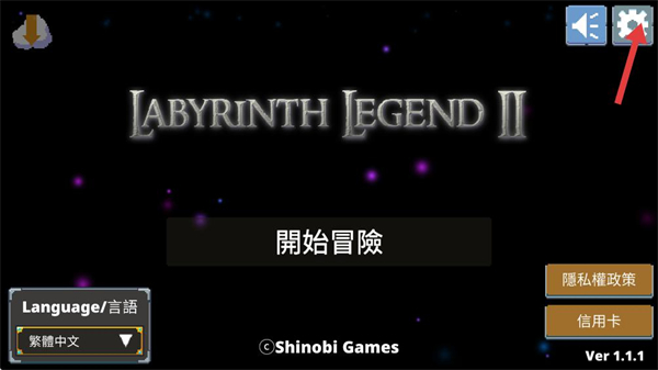 1、進入游戲主界面,可選擇語言,點擊右上角設置按鈕調整游戲參數,為冒險做準備。