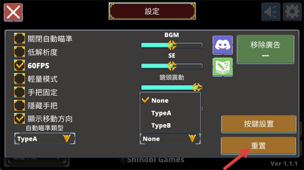 4、回到設定界面,可選擇自動瞄準類型、顯示回避按鈕等選項,點擊重置可將所有設置恢復為初始狀態,快速還原游戲基礎配置。
