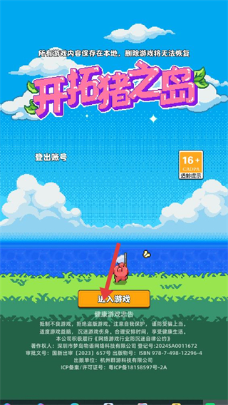 1、進入游戲啟動界面,點擊進入游戲按鈕開始冒險,該作是島嶼建設類游戲,以小豬角色為核心,在島嶼上開展建造與發展的玩法。