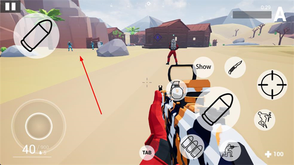 2、確認選擇的地圖后進入對戰,通過左側移動鍵控制角色在場景中移動,觀察周圍敵方目標,點擊右側射擊鍵瞄準敵人發起攻擊。