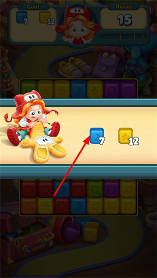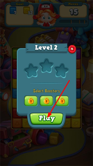 1、進入Level2的關卡界面,可見需收集7個藍色方塊和12個黃星星,當前操作步數為15,點擊Play按鈕即可開啟本關卡的消除挑戰。