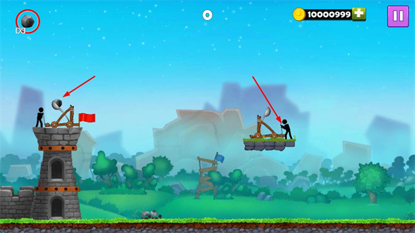 2、對戰時,操控投石機瞄準敵方投石機,調整角度與力度發射石彈,精準打擊破壞敵方設備,守護己方陣地。