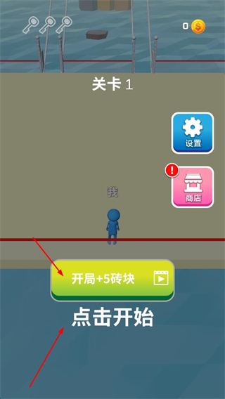 1、關卡1開局,可點開局加5磚塊看廣告獲額外磚塊,再點點擊開始按鈕進入收集環節,為搭橋備資源。