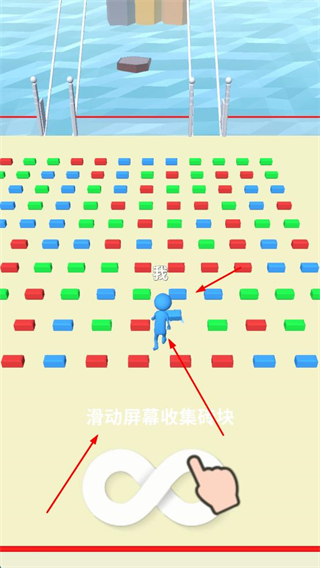 2、進入磚塊區,滑動屏幕控制角色移動,盡量多收集同色磚塊,注意規劃路徑,高效積累搭橋材料。