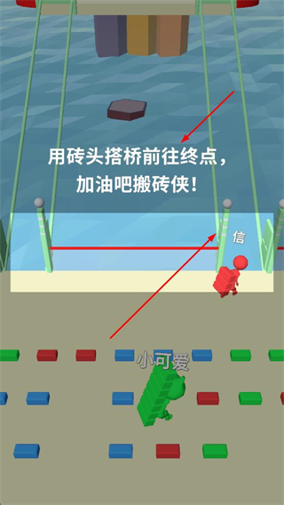 3、收集足夠磚塊后,到河流處,用磚塊搭建橋梁,連接兩岸,讓角色順利通過,抵達終點完成挑戰。