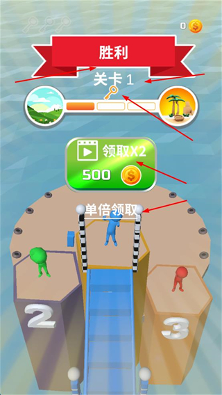 4、勝利后在結算界面,可以點擊單倍領取直接拿500金幣,或看廣告領取2獲雙倍,之后開啟新關卡。