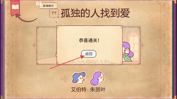 4、完成故事構建后,會顯示恭喜通關提示,點擊返回按鈕結束當前章節,準備開啟新的故事創作。