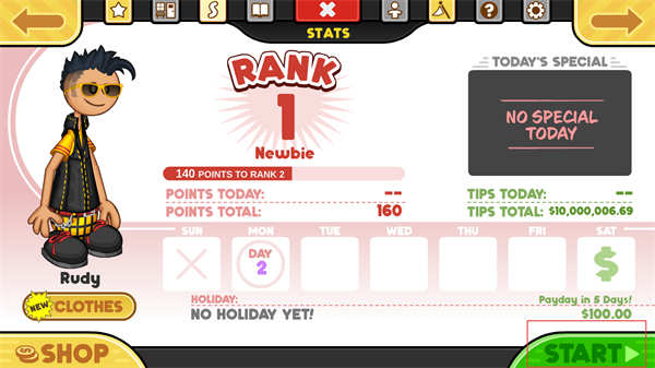 1、查看當前等級與積分情況,點擊START按鈕開啟第二天的經營,準備接待到店的顧客并處理訂單。