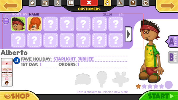1、查看顧客列表中Alberto的信息,了解其喜好節日與訂單數,點擊START按鈕開啟經營,準備接待顧客。