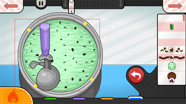 2、操作挖球器從容器中挖出薄荷味冰淇淋,獲取對應的甜品原料,為后續制作圣代做準備。
