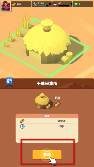 1、選擇對應的采集建筑,確認其成本與生產耗時后,點擊對應按鈕開啟采集,建筑會按設定時間產出資源,以此積累初始的物資儲備。