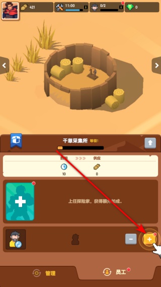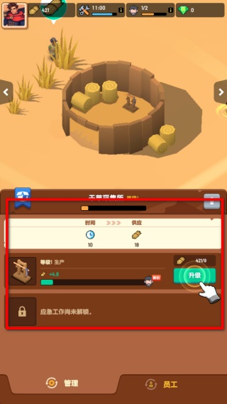 2、進入建筑管理界面,查看當前的資源生產進度,點擊員工選項可進入員工配置頁面,為后續提升采集效率做準備。