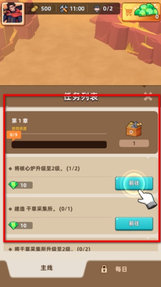 2、查看任務列表,選擇需要完成的任務,點擊前往按鈕進入對應操作界面,完成任務可獲取資源獎勵,同時推進主線的進度。