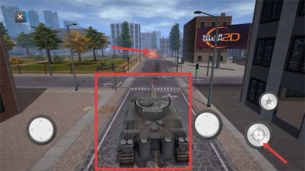 3、進入游戲操作界面,選擇載具破壞工具,通過虛擬按鍵控制載具移動,點擊右側瞄準按鍵進行開火操作,對目標車輛、建筑實施攻擊。