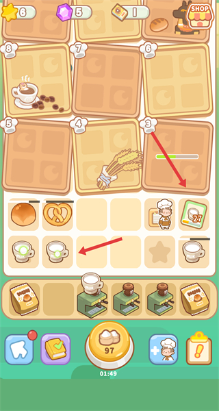 1、合成玩法作為生產核心,長按相同食物即可合并升級。從面粉到高級糕點的轉化過程直觀簡潔,產出反饋迅速。
