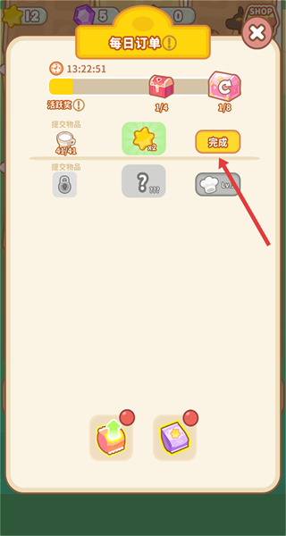 4、再次打開每日訂單界面,確認已準備好所需物品后,點擊完成按鈕提交訂單,獲取對應的獎勵,推進游戲進度。