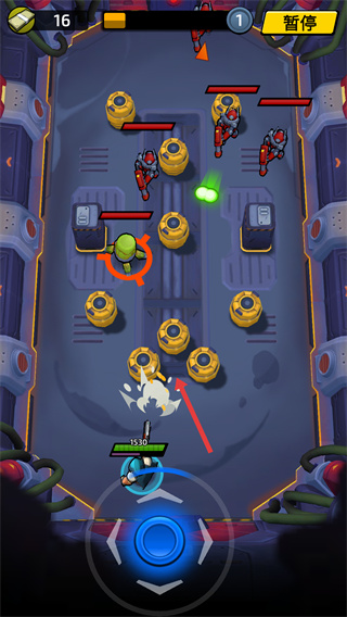 1、戰斗時操控角色移動,利用場景中的裝置作掩體,躲避敵方攻擊的同時瞄準目標輸出,留意界面上方的進度條與左上角的資源數。