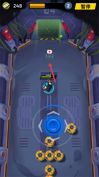 4、推進過程中若遇到帶有紅十字標識的道具,移動角色靠近即可拾取,該道具可恢復角色血量,拾取后繼續向帶有綠色光效的通道前進。
